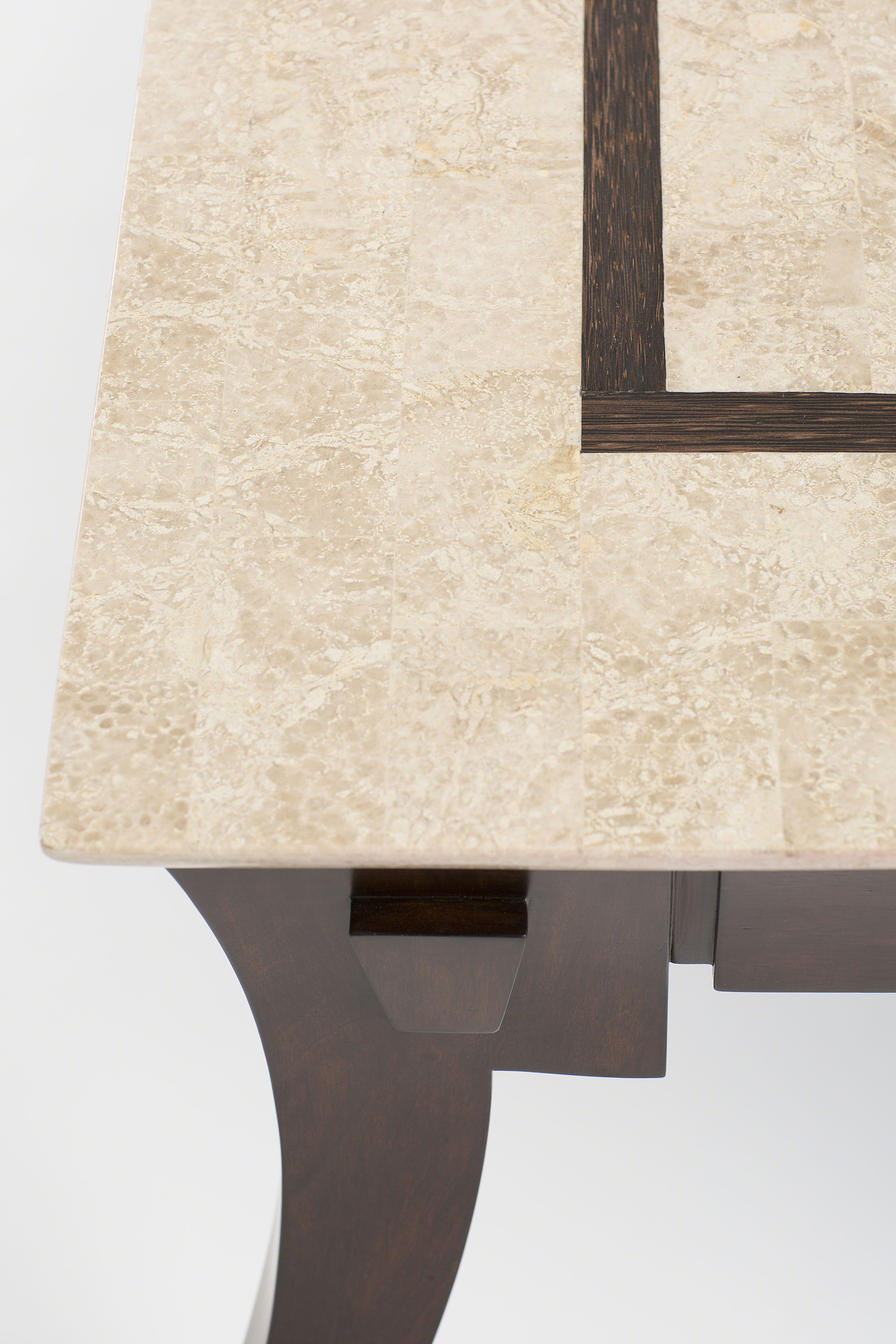 A variety of stone products including fossilized stone, marble, limestone, and granite are available in the Philippines for use as table tops, pedestal legs, and inlay. Mehitabel assists customers in sourcing these materials for use in the furniture.